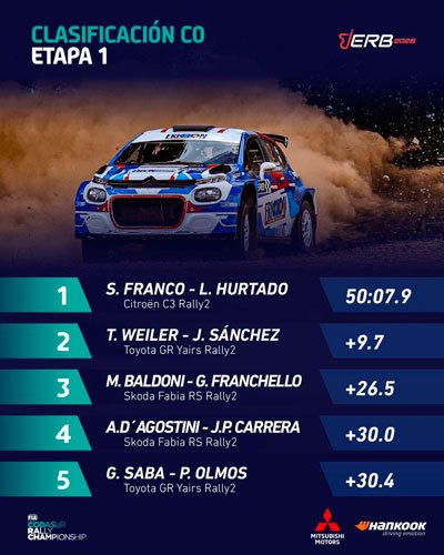 El boliviano Sebastián Franco (Citroën C3 Rally2) consiguió quedarse con la etapa inicial de la cita brasileña que abre el calendario 2026 del FIA Rally Sudamericano. Aventajó por 9.7 segundos al paraguayo Tiago Weiler (Toyota Yaris GR) y por 26.5 al argentino Miguel Baldoni (Skoda Fabia RS). Tres nacionalidades y tres marcas distintas en esta primera fecha del año.